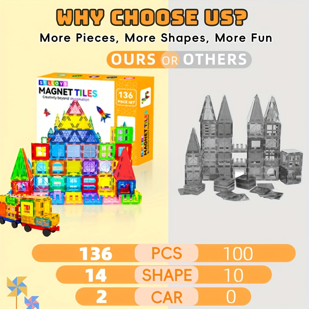 Discover the endless possibilities of creativity and learning with our Magnetic Tiles Building Blocks Set, featuring 136 or 106 pieces of vibrant STEM toys designed for young builders aged 3 and up. These durable PVC magnetic tiles come in a mix of bright colors and include 14 or 11 different shapes like squares, triangles, and rectangles, making it easy to construct imaginative structures such as houses, animals, vehicles, and so much more.