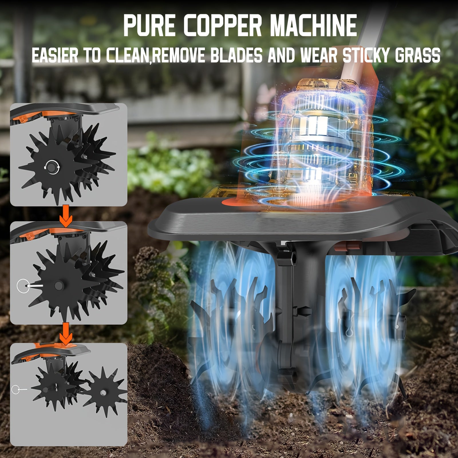 Built with a durable metal construction, it’s designed to withstand outdoor use and regular tilling. The tool includes a US plug and supports versatile charging, making it a convenient addition to any home garden toolkit.