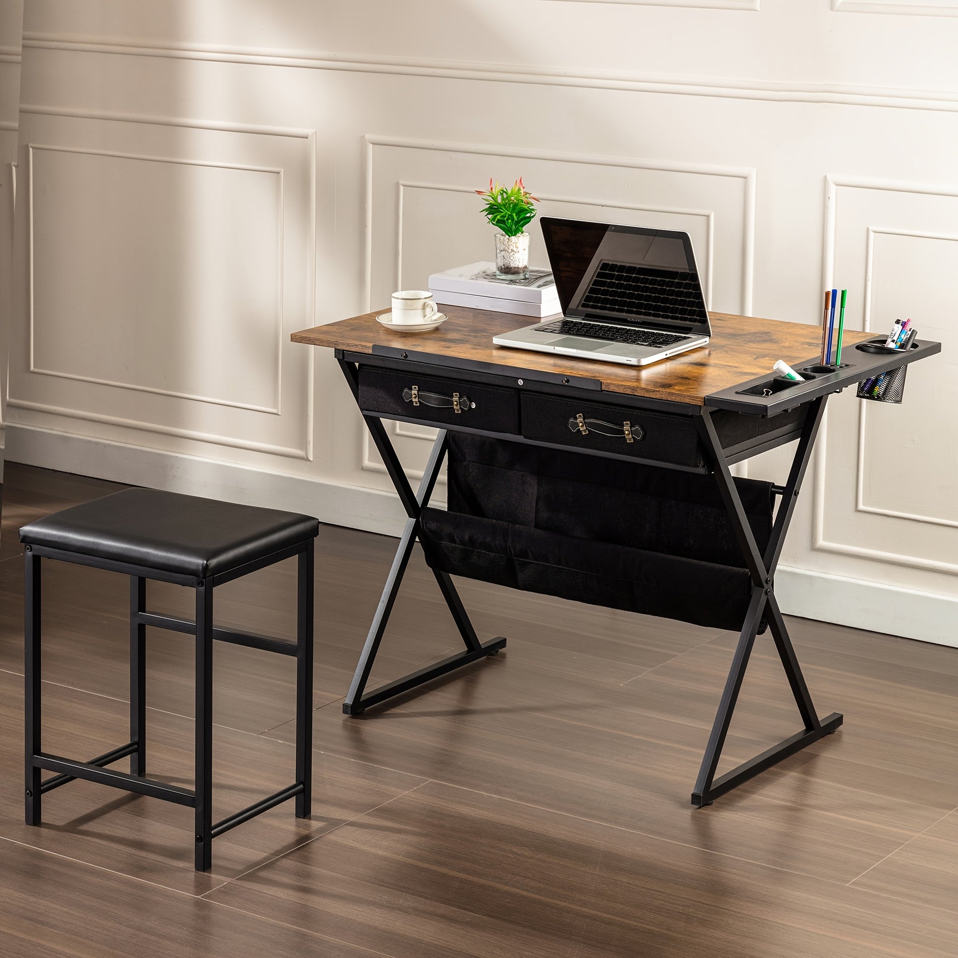 Brown Adjustable Drafting Table With Drawers And Stool
