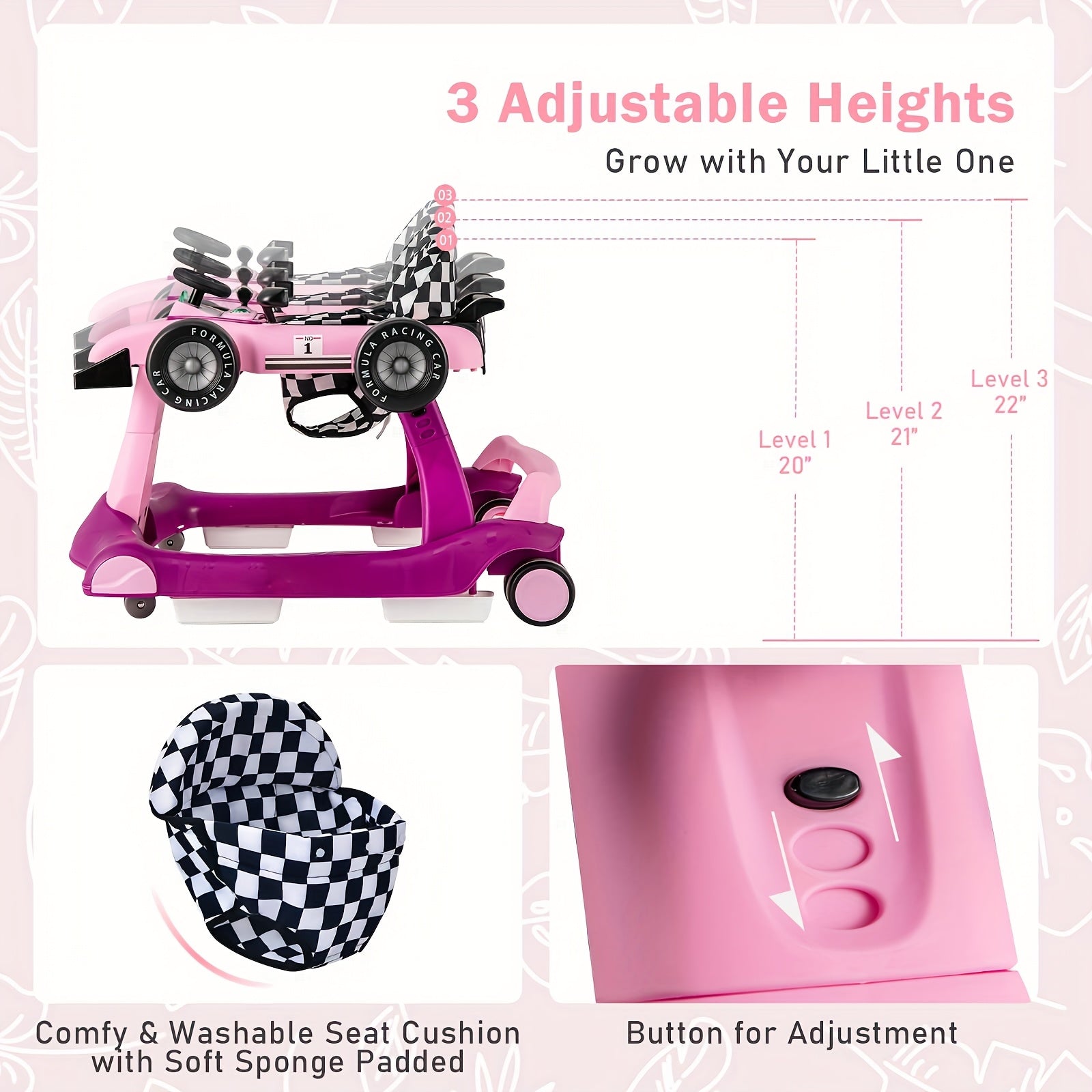 The walker includes a washable and detachable seat cushion for easy cleanup and long-lasting comfort during playtime and strolls around the house. Made from durable PP, it offers reliability you can count on during your baby's early adventures.
