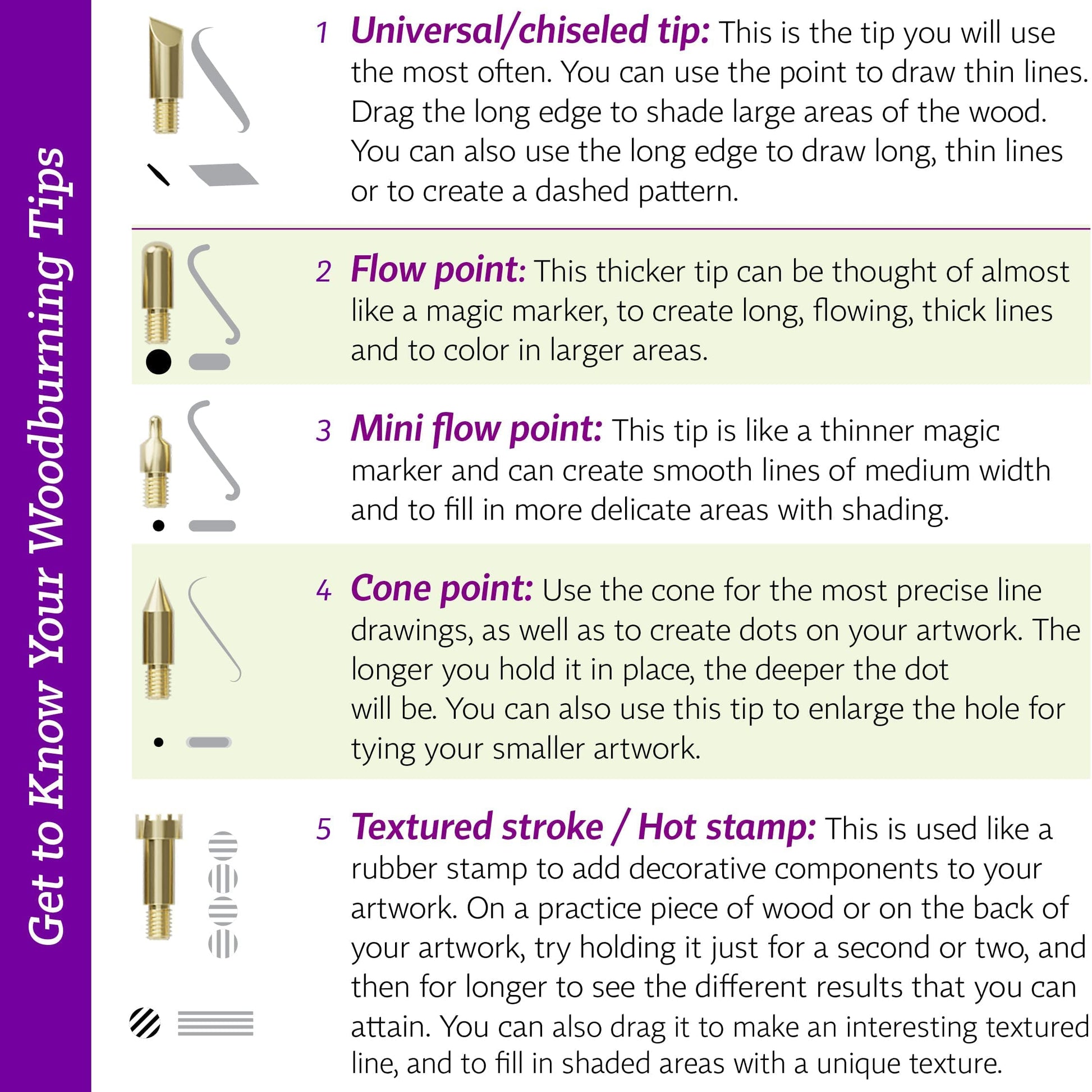 Premium woodburning tool: Heats up fast and emits steady heat for smooth lines. An ergonomic rubber grip fits every hand, plus a finger safety guard for peace of mind. The tool plugs into a standard wall outlet and comes with a convenient stand. Includes 5 interchangeable tips—universal/chisel, flow, mini-flow, cone, and textured stroke/hot stamp—to expand your creative possibilities.