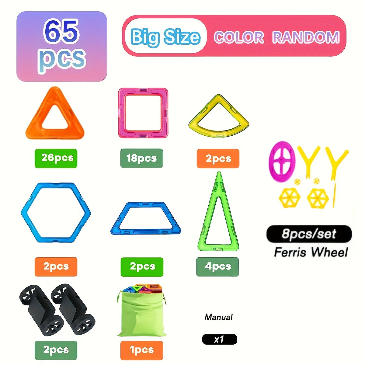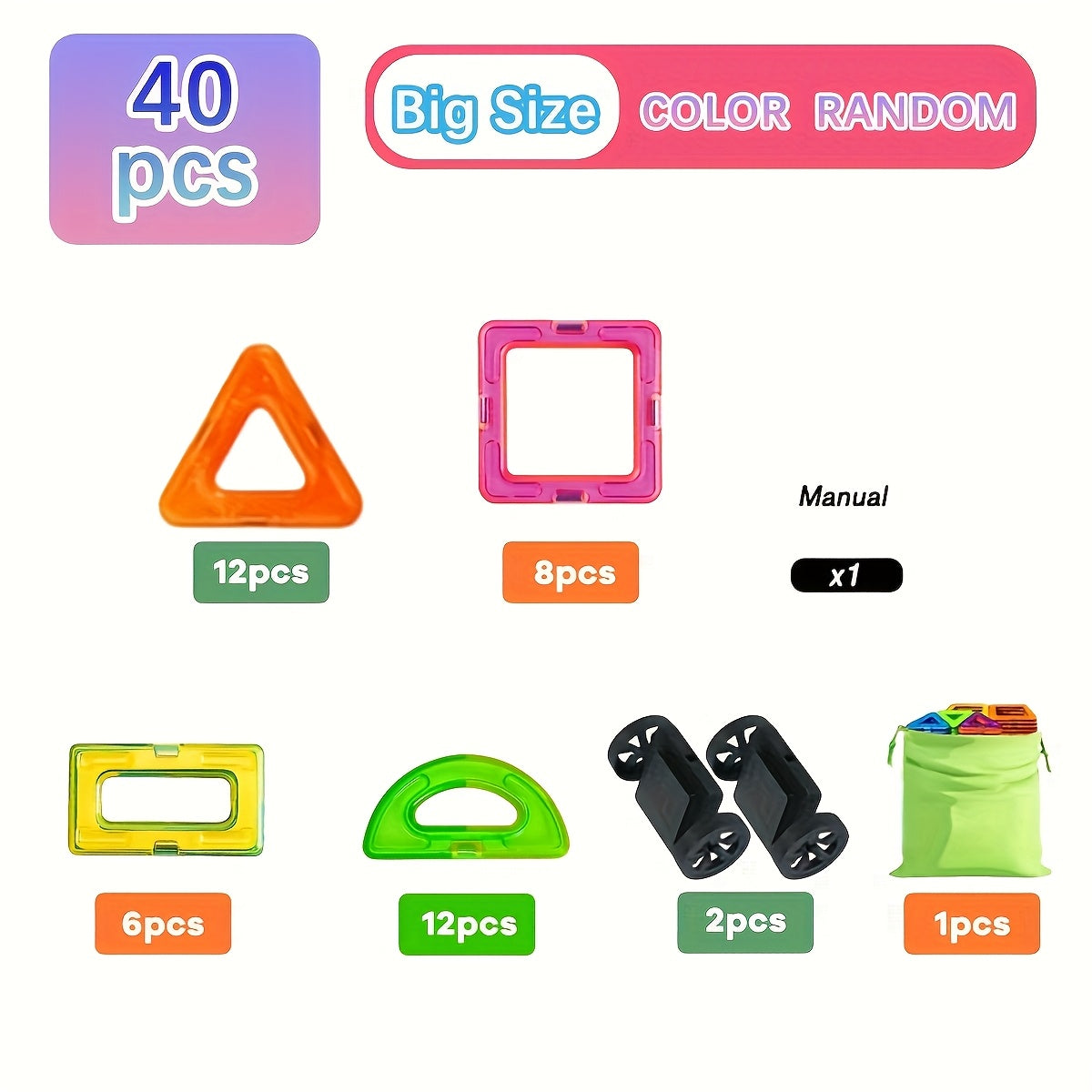 Crafted from durable ABS plastic and featuring mixed colors, these magnetic blocks click together with secure magnetic connectors, enabling quick assembly and stable structures. The included wheels let little builders bring their blueprint to life by turning flat designs into rolling machines, vehicles, and dynamic landscapes.