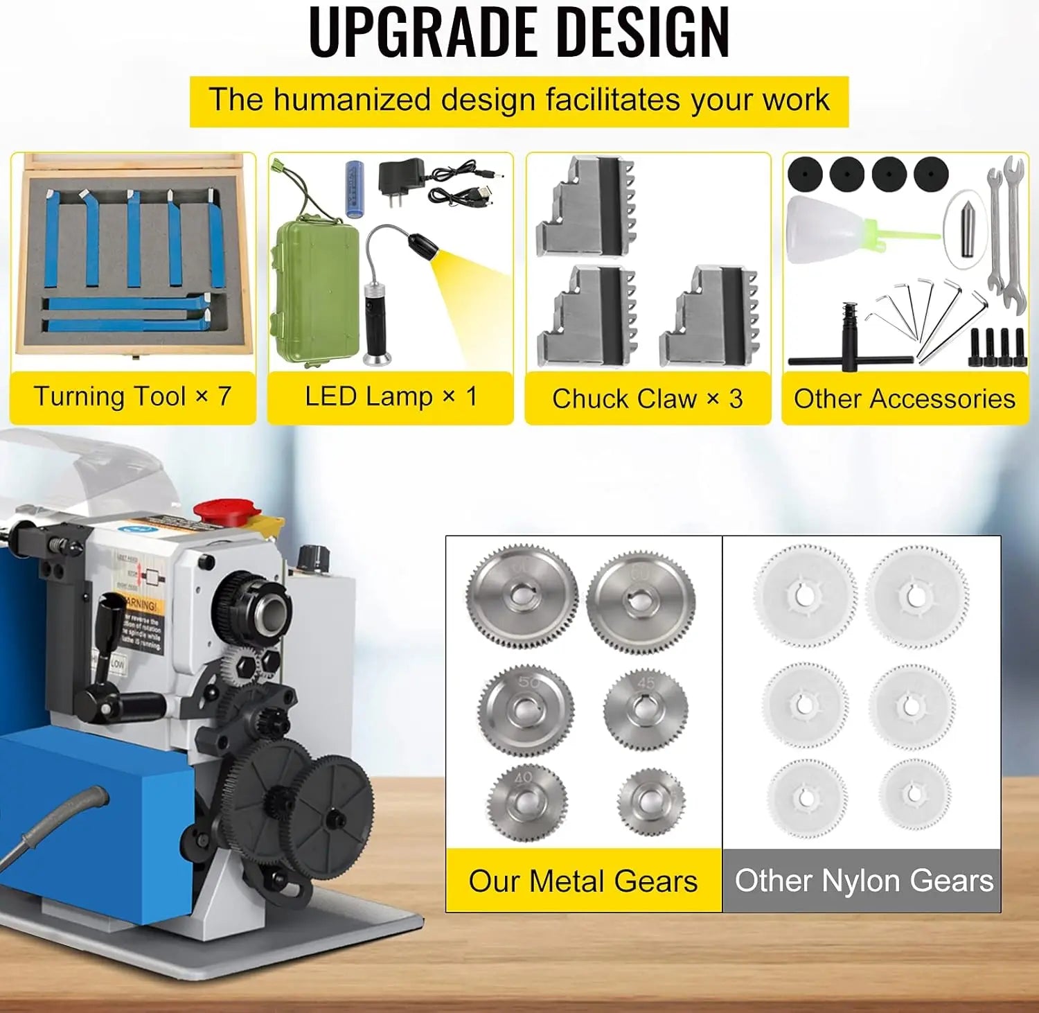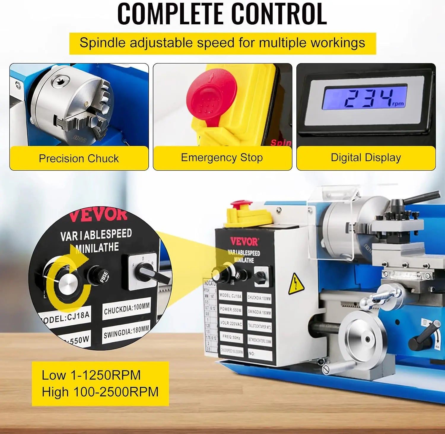 Discover the power and precision of the Mini Metal Lathe, 7"x14" Benchtop Metal Lathe, designed for both hobbyists and professionals alike. This robust machine features a 550W variable speed motor that can reach up to 2250 RPM, making it perfect for various metal turning tasks.