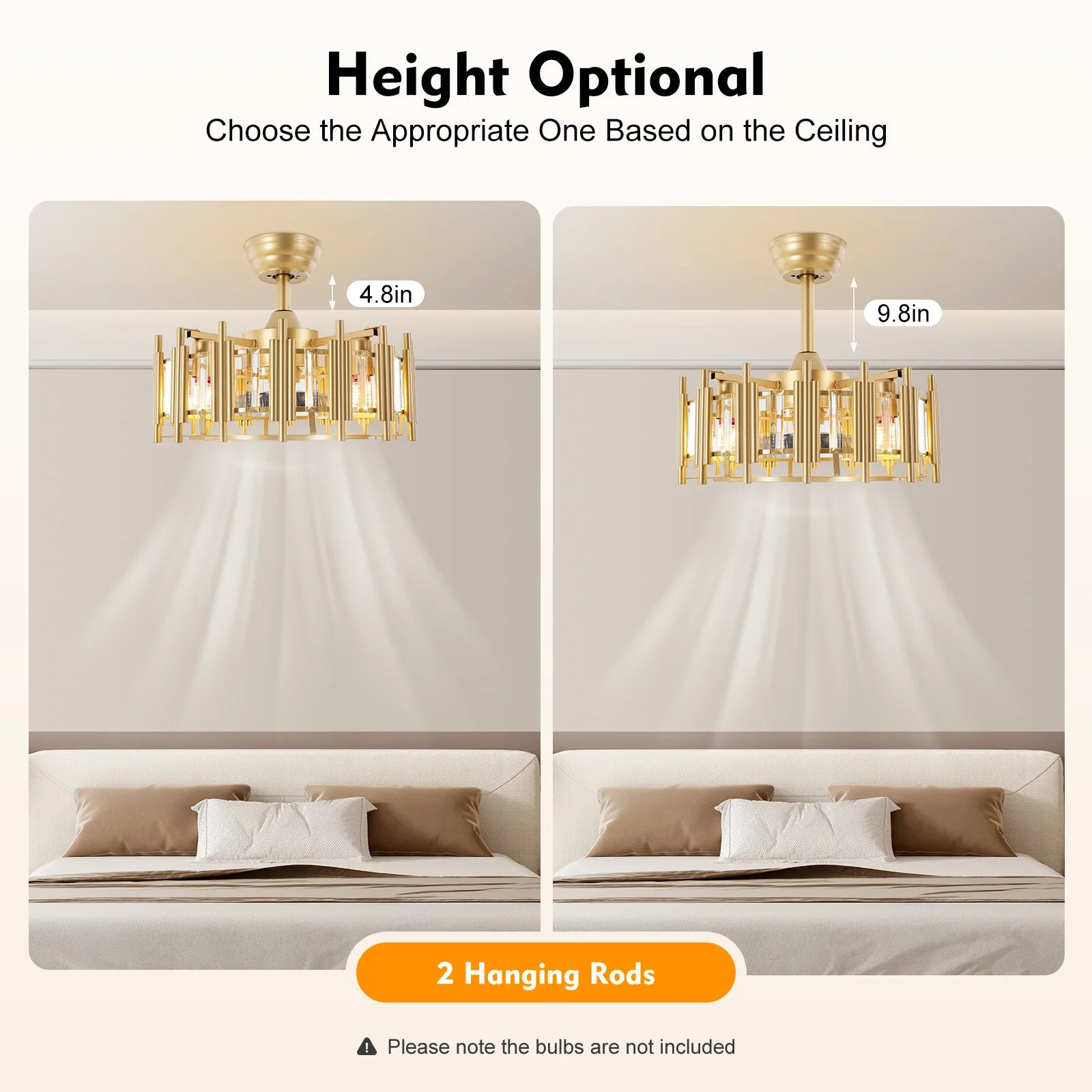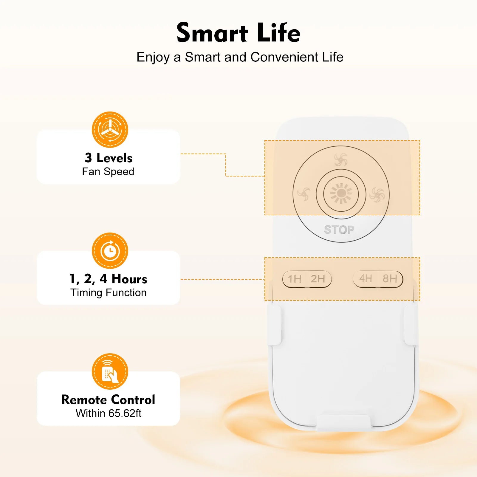 - Remote control included (batteries: 2x AAA). Adjust fan speed, light brightness, and set the timer from anywhere in the room.