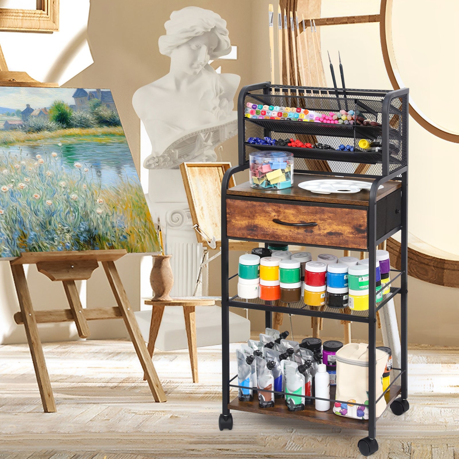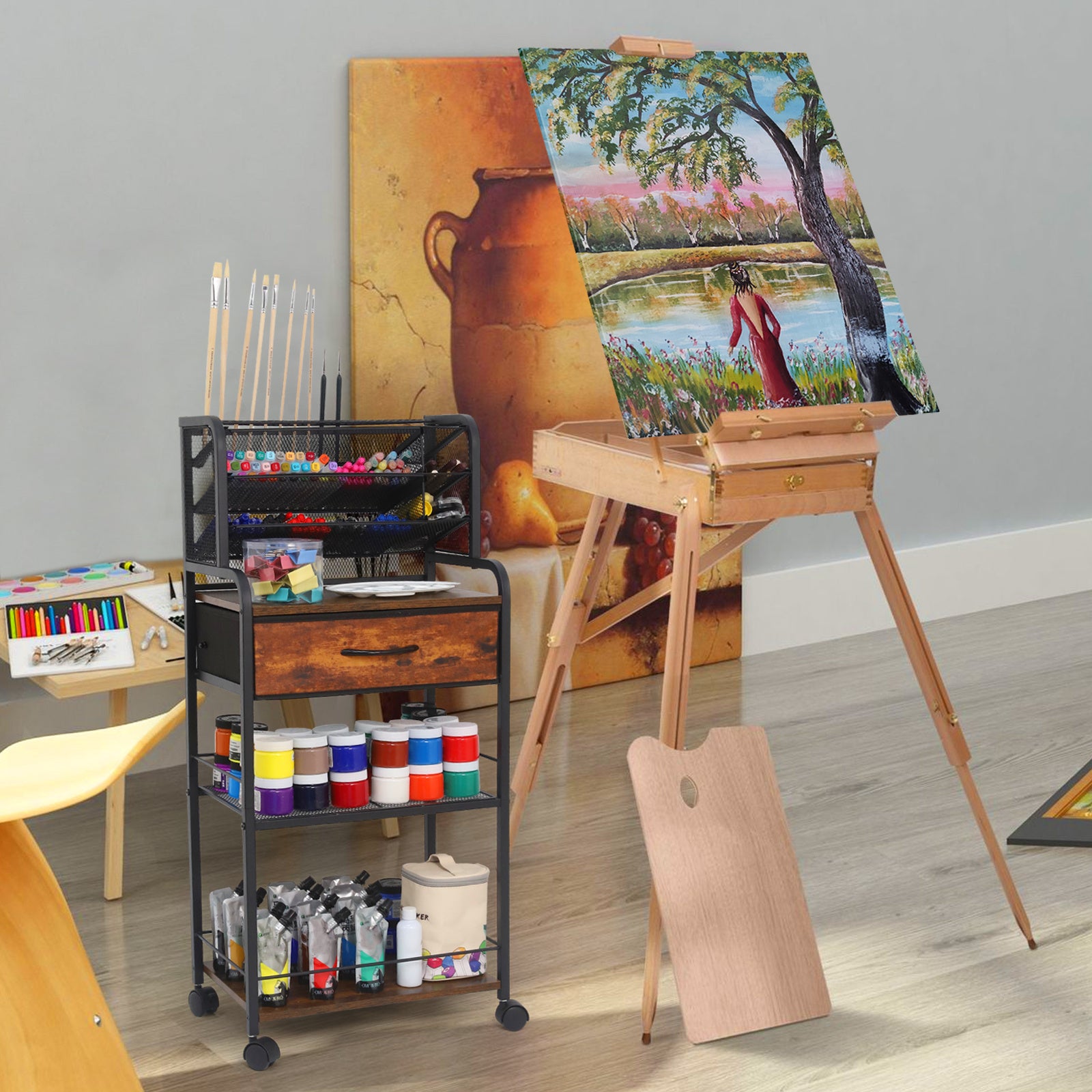 This cart stands out with its robust pull-out metal drawer, providing superior strength and a higher load-bearing capacity compared to fabric alternatives. Ideal for tools, crafts, or kitchen supplies, the drawer's design ensures your items are securely stored and easily accessible. Above the drawer, the wooden shelf adds a touch of natural elegance while supporting your heavier items with ease.