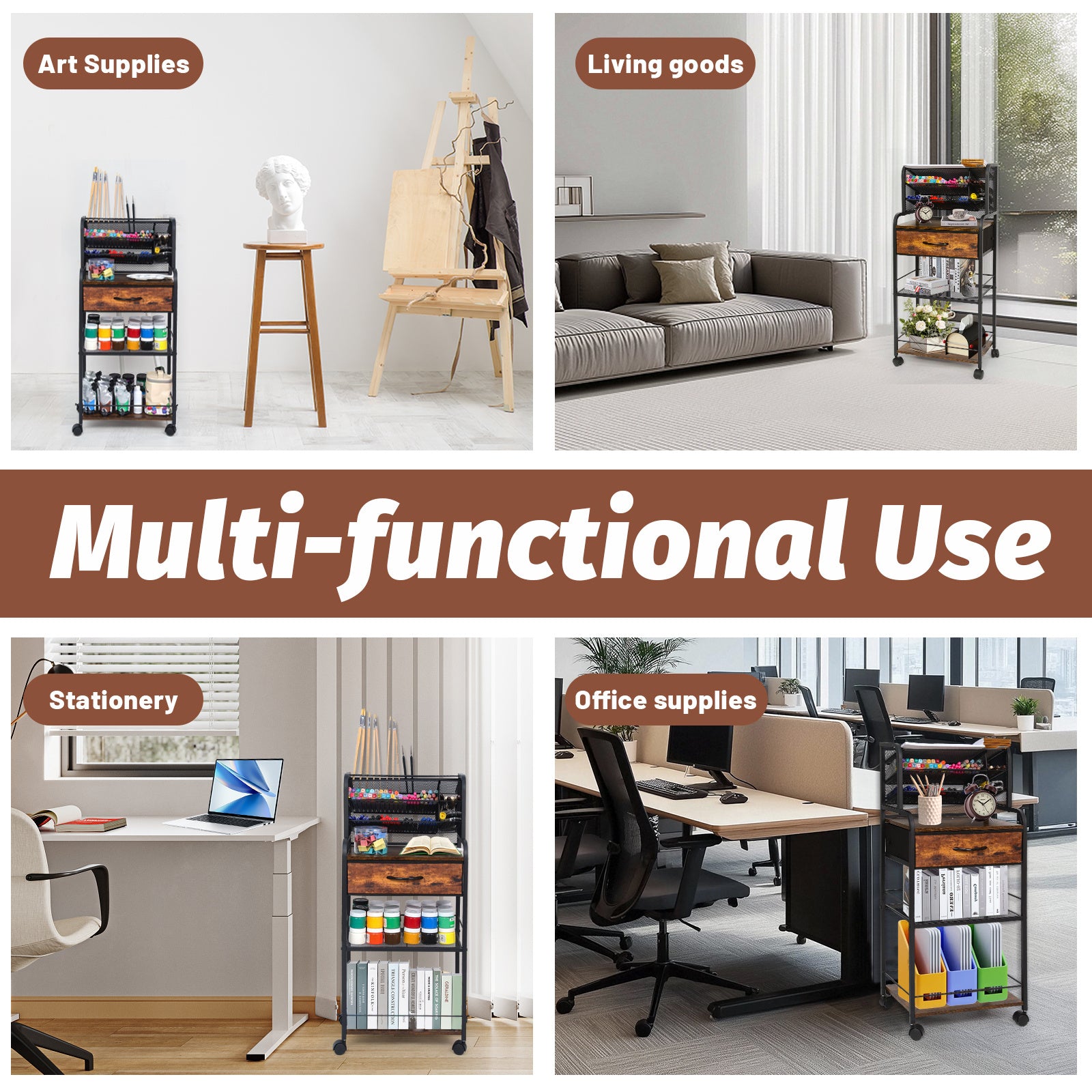 Elevate your daily routine with this multifunctional utility cart that combines practicality with modern design. Whether you're organizing your workspace or decluttering your living area, this cart's functionality and appeal make it an essential addition to your home.