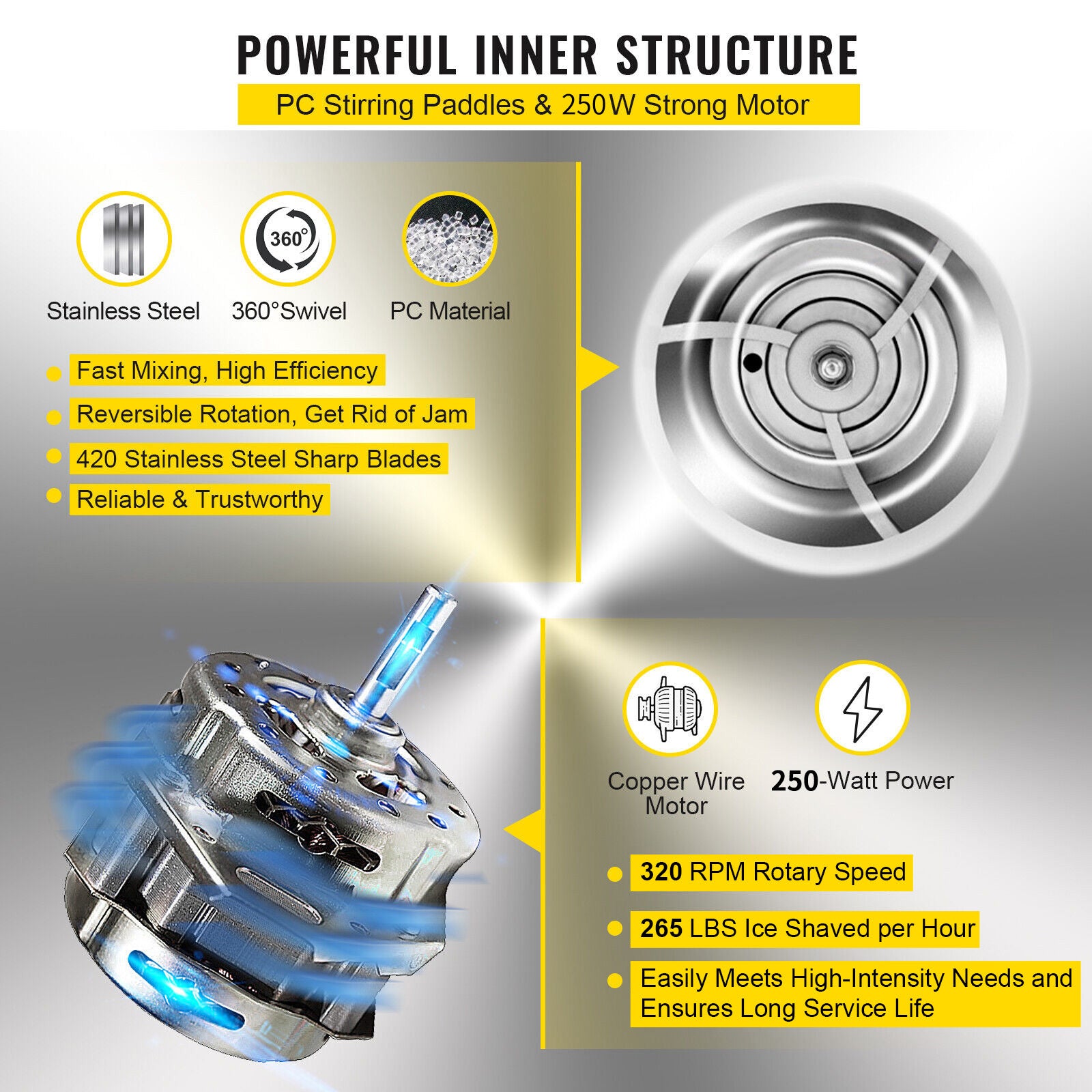 - Ice shaving capacity: up to 265 lbs (120 kg) per hour